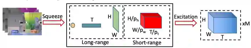 为了实现对视频信号中多时空依赖的建模,本文使用“特征压缩→依赖激活”的范式。具体来说,视频数据具有时空两个维度,对视频数据的某个维度进行平均池化即可实现视频特征的压缩以获取对应的时空依赖。之后,对另外一个维度进行卷积操作实现依赖的激活。除维度以外,上述特征压缩的尺度也决定了获取的依赖的特性,例如全局与局部特性。通过改变上述过程中池化/卷积核的大小以及维度,我们实现了长距离时空依赖(LST),长距离空间依赖(LS),长距离时间依赖(LT)以及短距离时空(S122)依赖的建模,如图1所示: