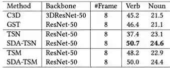 为了检验SDA对于视频动作分类的有效性,我们将SDA插入TSN以及TSM模型,表1-3分别展示了SDA在Something-Something V1&V2、Dinving48以及Epic-kitchen55上的性能表现。