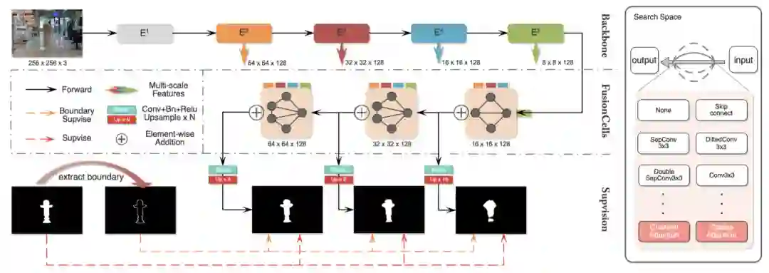 图二展示的是我们提出的可搜索的融合细胞,与普通的细胞不同,我们直接将从编码器拿到多尺度特征作为融合细胞的搜索节点,让网络有更多可以选择的融合策略,进一步提高模型性能,于此同时,我们将该细胞的部分可搜索边进行了裁剪,这样做的目的在于可以将搜索时间从10小时缩短至3小时。