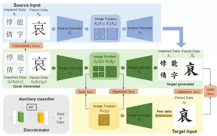 图1展示了ZiGAN将宋体迁移为瘦金体。ZiGAN的网络结构展示在图2中。首先,我们基于循环的思想,提出了一种端到端网络。该网络不仅只需要少量的目标风格字符作为参考,且可以快速适应新的任务。其次,我们创新性地利用了不配对的字符的信息以进行学习。虽然我们只能获得少量的目标风格的字体,但是我们可以轻易地获得大量的源字体,而在源字体中仍然含有非常丰富的结构知识。在实验中我们使用宋体作为源风格字体。在训练过程中,我们使用配对的字来学习不同风格的字体间精细的结构关联。同时,使用了最大均值差异(MMD)以在特征维度上最大限度地学习不配对的字的结构信息。