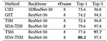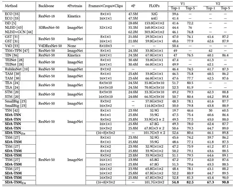 表 1 SDA与其他SOTA方法在Something-Something V1&V2上的性能比较