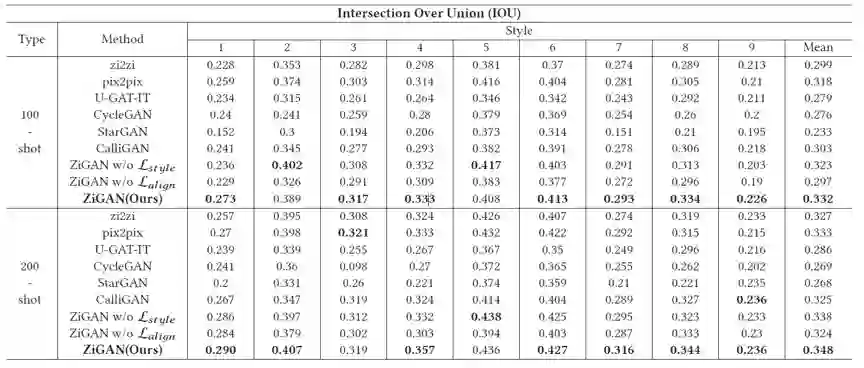 我们从风格和形态两个层面来定量评价ZiGAN的结果。如表1和表2所示,结果表明ZiGAN在少量数据的字体风格迁移领域,和其他的先进方法相比取得了更好的效果。