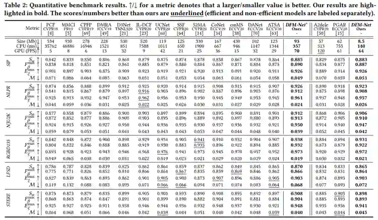 此外,我们还设计了轻量编码器-解码器框架,包括定制深度骨干(Tailored depth backbone,TDB)和两阶段解码器(Two-stage decoder)以进一步提升模型效率。最后,将DQFM嵌入到该框架中构建出名为DFM-Net的高效RGB-D SOD模型。大量实验结果表明,即使与非轻量模型对比,DFM-Net的精度也达到了最先进的水平,同时其在CPU上的推理耗时为140ms(约为现有最快模型速度的2.2倍),模型体积仅有8.5Mb(约为现有最轻量模型的14.9%)。