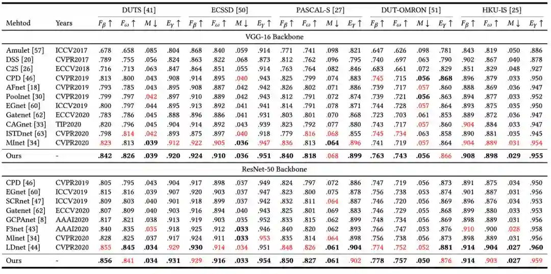 模型性能可视化结果对比如图5所示(其中圆形图例面积表示模型体积)。本文方法在推理速度、模型大小、准确率上的表现均超过了以JL-DCF为代表的先进方法,特别是在模型体积和推理速度方面与现有方法拉开了较大的差距。