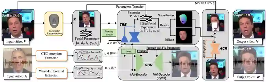 生成具有视听真实感的说话肖像视频是一个具有挑战性的工作,它主要包含有三个方面的难点,1. 声学特征和身份特征没有完全解耦,难以获得全局的语音到面部混合形状的映射函数;2. 由简单的UNET结构组成的面部coarse-to-fine的渲染网络难以补获长时间视频,并且生成的视频通常缺乏时间一致性和空间相关性,导致细节变化的一致性存在缺陷;3)之前的伪造方法都是在帧或者视频级的伪造,缺乏考虑语音上的伪造,包含语音伪造的多媒体内容更具有视听真实感。基于以上存在的三个问题,本文提出了一种新颖的面部音视频内容编辑方法(TACR-Net),它由主要由三个部分构成,语音到面部表情混合参数转换模块,语音音色渲染模块以及视频渲染模块三部分构成。其中语音到面部表情混合参数转换模块可以实现将任意输入的语音提取特征后转化为对应的面部表情混合参数,这里和我们不需要对于不用的身份的视频进行重新训练,音色渲染模块可以将在语音到面部表情混合参数转换模块使用的语音特征同步转化为不同的身份的语音,同时保持说话的内容不变。最后通过视频渲染模块将通过漫反射渲染的粗糙纹理面部合成为具有视觉真实感的面部视频。整体的流程在 图.1 中, 这里我们将英语女主播的视频使用特朗普的语音进行编辑,编辑后的结果是唇形与特朗普语音对齐的女主播视频,于此同时语音也被编辑为特朗普马的语音内容,但是音色依旧保持不变。