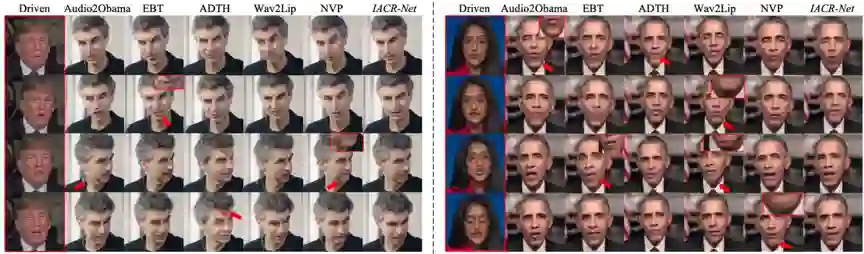 我们复现或者遵循官方开源代码重演了其他基于语音的面部合成算法,并且将这些算法和我们的算法进行对比,对比可视化结果如 图.3 所示。从 图.3 中可以发现我们的方法能够合成最为真实的帧级的面部图像。例如,在和当前最为流行的方法 Neural Voice Puppetry: Audio-driven Facial Reenactment x相比,我们的方法在面部表情差异较大时合成的面部更加真实,这是由于我们的方法不需要对于渲染后的面部进行贴合到背景之中,不会产生明显的面部边缘贴合纹理,这种痕迹通常是由于原始表情和编辑后的表情有较大差距导致的。额外的,对于其他的相关方法,我们的方法无论是在背景还是在面部纹理上都有着明显的优势。对于视频级的结果,我们将其添加在视频附件中。