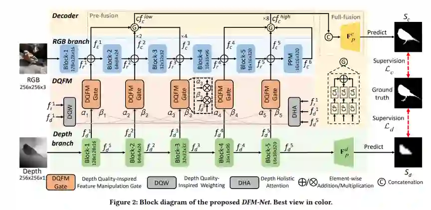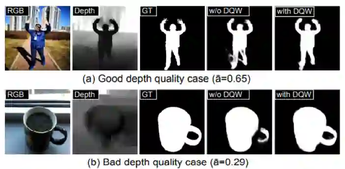 自深度传感器的普及以来,RGB-D显著物体检测(Salient object detection,SOD)任务吸引了越来越多学者的研究兴趣。然而,现有的RGB-D SOD模型难以兼顾效率和精度,不便于移动设备的部署。我们指出深度图质量是影响检测精度的关键因素,基于该观察,提出一种深度图质量启发的特征控制(Depth quality-inspired feature manipulation,DQFM)过程,它可以根据深度图质量过滤深度特征,有效提升模型精度,并且具有轻量高效的特性。