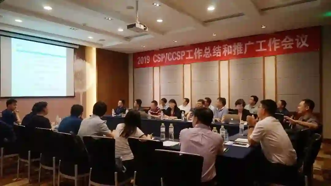 颁奖会后,7月20日,CCF召开了2019年CSP/CCSP工作会议,CSP优秀单位和历年CSP卓越单位代表包括副院长、认证点负责人共30余人参会,王新霞主持。陈文光代表CCF介绍了CSP在2018年及2019年上半年取得的成果以及新举措,并对2019-2020年度的工作进行了展望。会议邀请今年5月举办CCSP分区赛的7个承办高校代表——哈尔滨工业大学(东北赛区)孙大烈、北京邮电大学(华北赛区)靳秀国、湖南大学(华中赛区)洪跃山、南京航空航天大学(华东赛区)赵蕴龙、深圳大学(华南赛区)蔡树彬、西安电子科技大学(西北赛区)陈龙、四川大学(西南赛区)段磊分享了他们在CSP认证、CCSP竞赛,特别是CCSP分区赛承办组织方面的经验,并提出了宝贵的建议。截止目前,CCF已成功举办16次CSP认证,来自全国300余所单位的98599人参加了认证。CCF CSP认证的影响力越来越大与各高校计算机学院的大力支持密不可分。各参会高校代表就如何扩大CSP的影响也积极建言献策。部分知名企业如小米、携程、小马智行的HR校招负责人列席了会议。