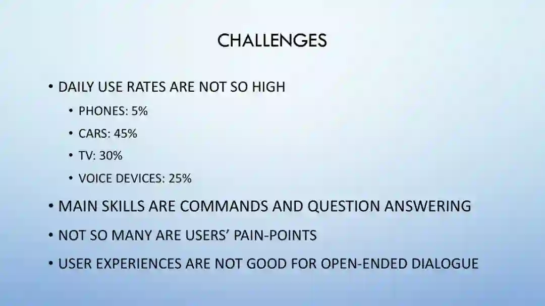 但是市场调查也发现,真正使用语音助手的用户并不是特别多。例如,尽管智能手机上基本都有语音助手,但是大概只有 5% 的用户使用或使用过这样的技术。