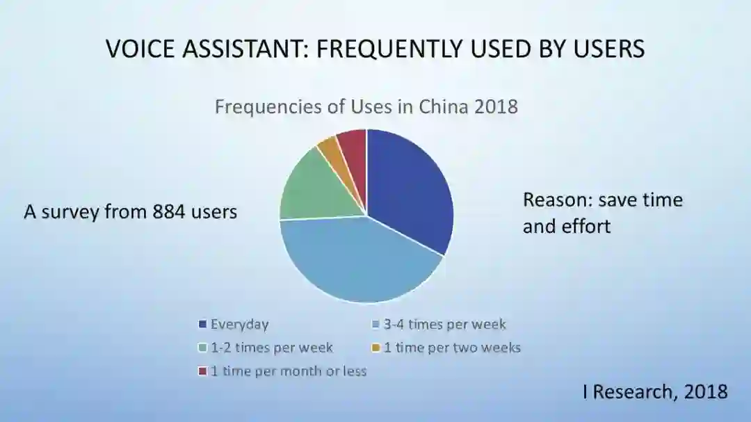 对话技术已经在市场上开始普及。在国内,有调查显示,在去年每天使用语音助手的用户中,频繁使用的用户(每天使用和每周使用语音助手的用户)可以占总用户数量的 3/4 左右。