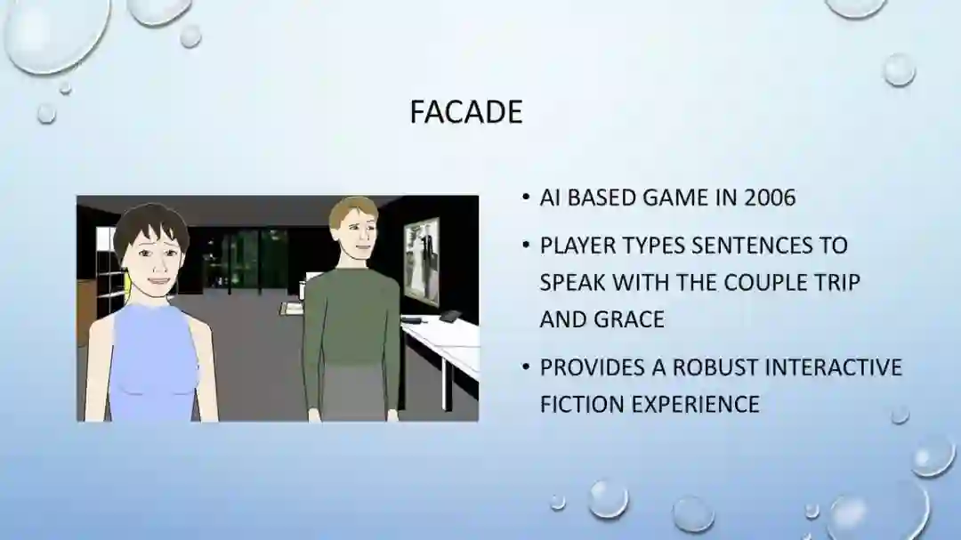 对话系统还有一种机会就是在游戏里面。比如说,这个是比较古老的游戏,叫做 facade。有一对夫妇住在一个公寓里面,玩家可以进入这个公寓,两个夫妇正在吵架,玩家需要敲键盘,用英语跟他们对话。聊天对话的结果有两种,一种是帮助这两个人和好,一种是帮助这两个人分手,还有一种是用户说话的时候得罪了这两个人,最后被赶出房间。大家都说这个游戏设计得很有意思,得了很多奖。