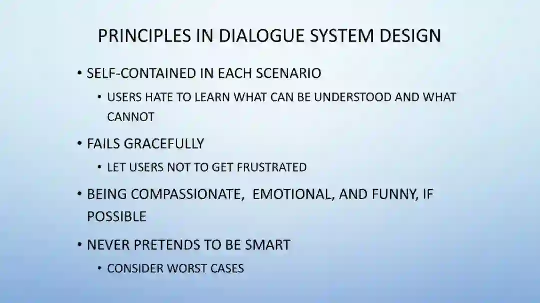现在我分享个人总结的在字节跳动和以前华为工作的一些经验,设计对话系统中应该遵循的原理或者规则。大概有四条。