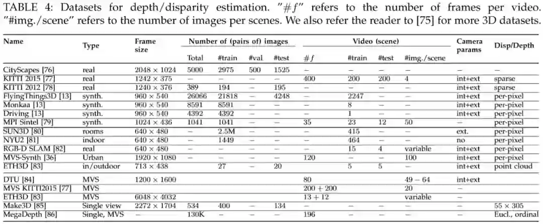 TABLE 4为双目深度估计数据集。另外多视的算法测视需要人工合成数据集。