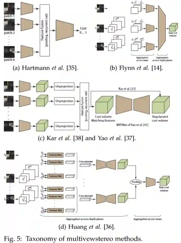 除了从一个像对中重建深度(视差)图,也可以从n个像对中重建,也就是说将特征计算的网络分支复制n次。多像匹配网络分两种。