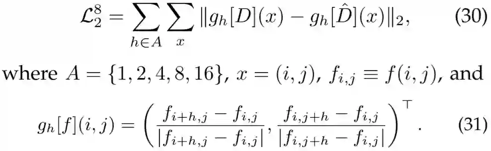 loss函数的功能在于描述估计视差(深度)和真实值的差异,并用它来调整网络权重。一般来说loss由两部分组成,如公式7。 为估计的深度图, 为真实深度图, 为训练集, 为网络权重。