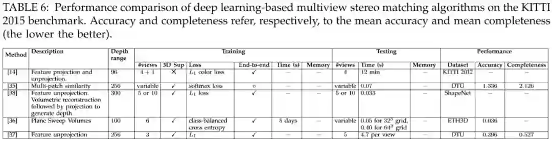 TABLE 6比较了五种深度学习多视重建算法。TABLE 6中大多使用了有监督学习,且大多没有达到子像素精度,需要提前给定深度的计算范围且在不调整网络结构重新训练的情况下,无法更改范围。另外,这些方法在重建细微的特征(比如植被)时会计算失败。