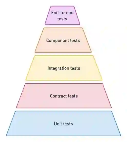 这是微服务测试金字塔的一个版本。其他版本可能顺序上会有所不同。有些版本可能将契约测试包含在了集成层。事实上,金字塔更多的是一份指南,而非一成不变的东西。