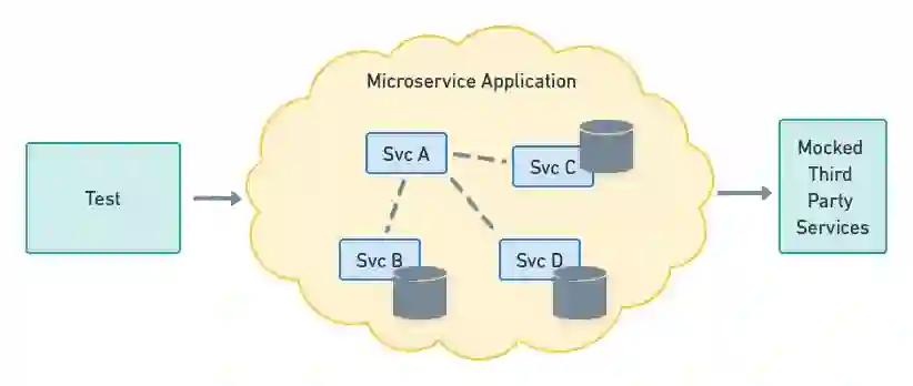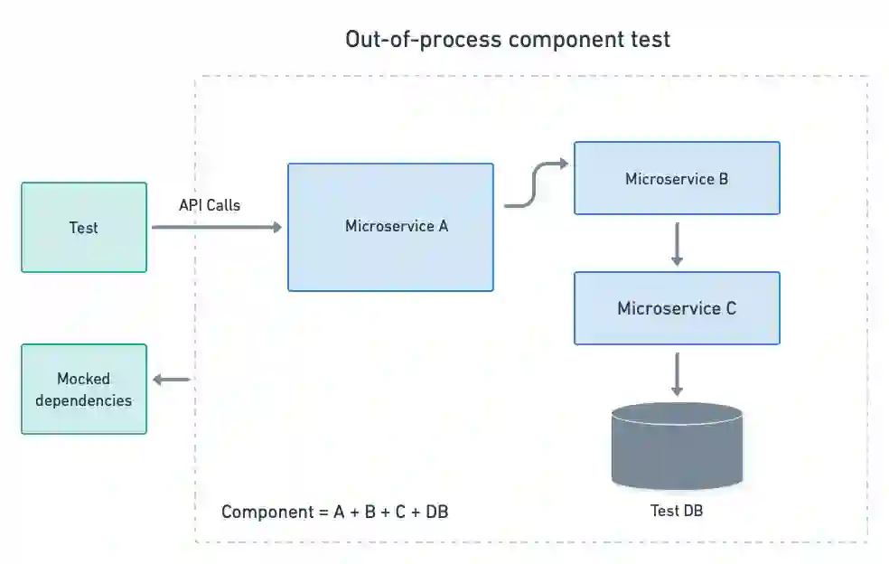 进程外测试适用于任意大小的组件,包括由许多微服务组成的组件。在这类测试中,组件被(原封不动地)部署在一个测试环境中,所有的外部依赖都是以模拟或存根方式提供。