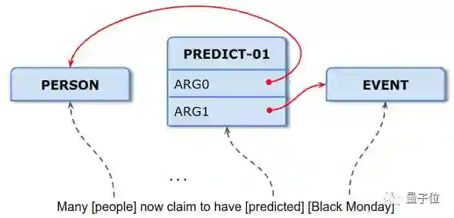 比如说句中的“predict”,就表示为PREDICT-01框架。PREDICT-01和施行predict这个动作的主体有交互(插槽),通过ARG0插槽表示,ARG0与表示“people”的PERSON框架相连接;PREDICT-01还和被预测的客体有交互,表示为ARG1插槽,和表示“Black Monday”的EVENT框架连接。