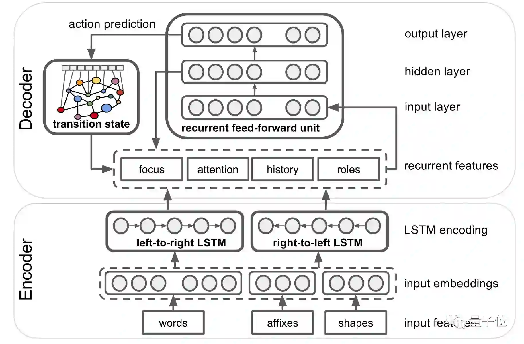在内部,SLING使用编码器-解码器架构,其中使用诸如原始单词,其后缀,标点符号等简单词汇特征将每个输入词编码成向量。而解码器用这种表示和自己历史中的循环特征,来计算更新框架图示以获得输入句子的预期框架语义表示所需的转换序列。