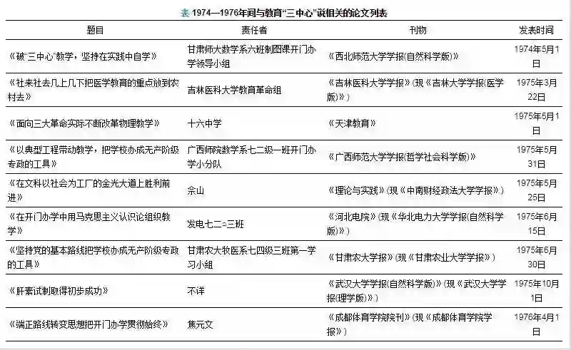 自1974年起,“文革”期间发表的一些相关论文,无一不是在反对教育“三中心”说。根据中国知网(CNKI)提供的资料信息,我们将这些论文的具体情况统计如下: