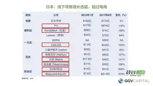 日本的市场又是什么样子的呢?日本市场非常奇怪。你要是用日本的零售公司做同样的分析,把电商、便利店、一元店、百货药妆店等等做比较的话,你会发现在日本,电商成长速度反而没那么快——日本电商第一名的乐天,从2012年到2017年市值其实没有太大的变化。