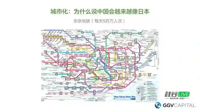 08年第一次去日本的时候,去京东地铁站看地铁图,我数一数,大概有20多条线,各种颜色,一天有800万人会乘东京的地铁。一天大概有3500万到4000万的人,每天坐高铁去东京,因为东京房租很贵,所以几十年工业化的结果就是很多人搬到东京以外的地方,每天坐高铁去东京上班。未来北京和上海这样的大城市可能也都会成为东京这样。