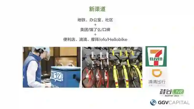 最后结果是什么呢?新渠道就变成在所有重要的场景里,不管是地铁铁站或者是办公室或你的小区里,应该会有蛮多的各种的便利店,而且呢通过摩拜、ofo、HelloBike、饿了吗、美团会把各种的订购的商品送到你那边去,很多食品的触手可及的范围内,这些会让我们的生活变得更方便。
