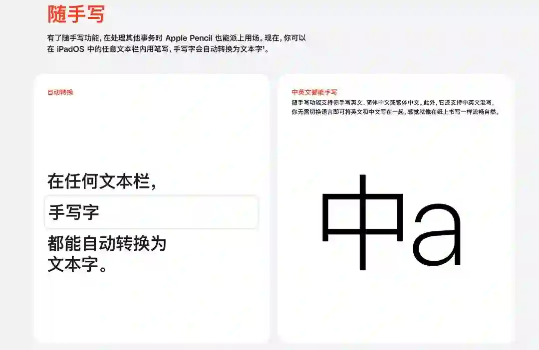 依靠 iPadOS 14 中的随手写,您可以使用 Apple Pencil 在任何文本栏中书写,然后系统会将书写的文本转换为键入的文本。该功能意味着当您需要撰写电子邮件,编写日历事件,访问 URL,发送 iMessage 消息或进行搜索时,无需切换到键盘就可以使用 Apple Pencil。