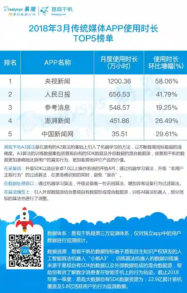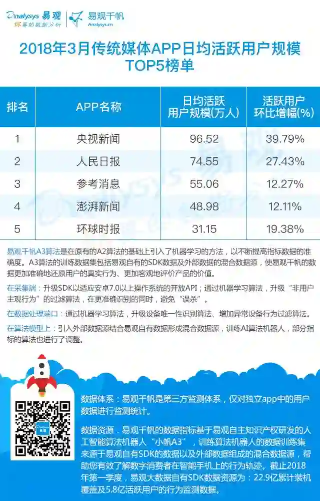 2018年3月,人民日报以423.98万月活跃用户规模占据榜单第一,央视新闻月活跃用户191.94万位列第二,参考消息、澎湃新闻、中国新闻网位列3-5位。