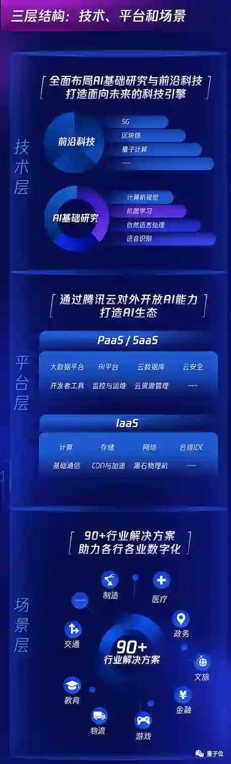 在平台层,腾讯云打造了「一云三平台」的新基建布局,通过腾讯云等对外开放AI能力,借力算法平台、服务平台以及开放平台,降低AI的应用门槛,实现AI技术的场景落地。