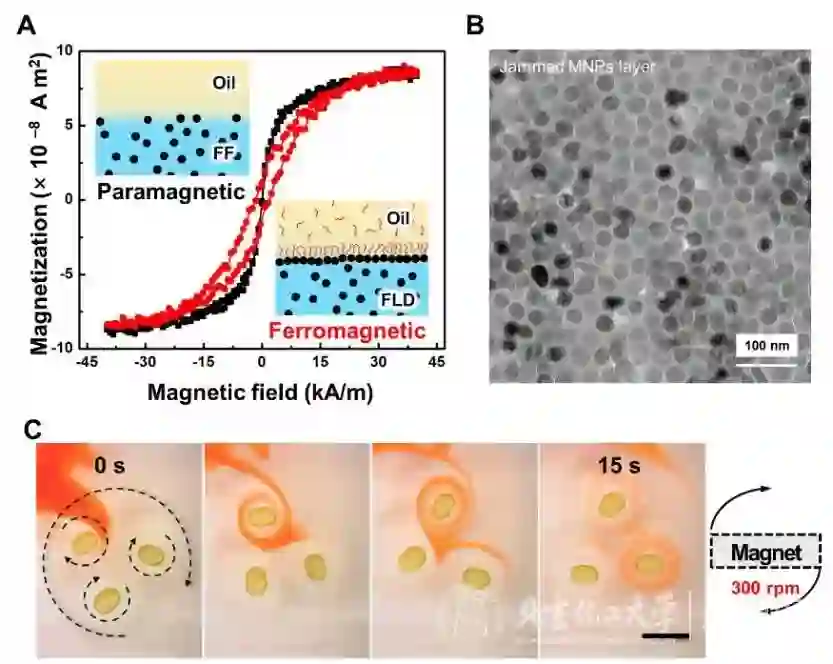 (A) 示意图表示水相中的磁性纳米粒子与油相中的配体在水油界面自组装形成致密的二维纳米薄膜及铁磁液滴;磁滞回线表明铁磁流体在组装前后发生的顺磁-铁磁转变;(B) 水油界面发生阻塞相变的磁性纳米粒子的透射电子显微镜照片;(C)悬浮在油相中的铁磁液滴在外部磁场作用下旋转,红色染料记录了液滴周围液体的湍流轨迹。