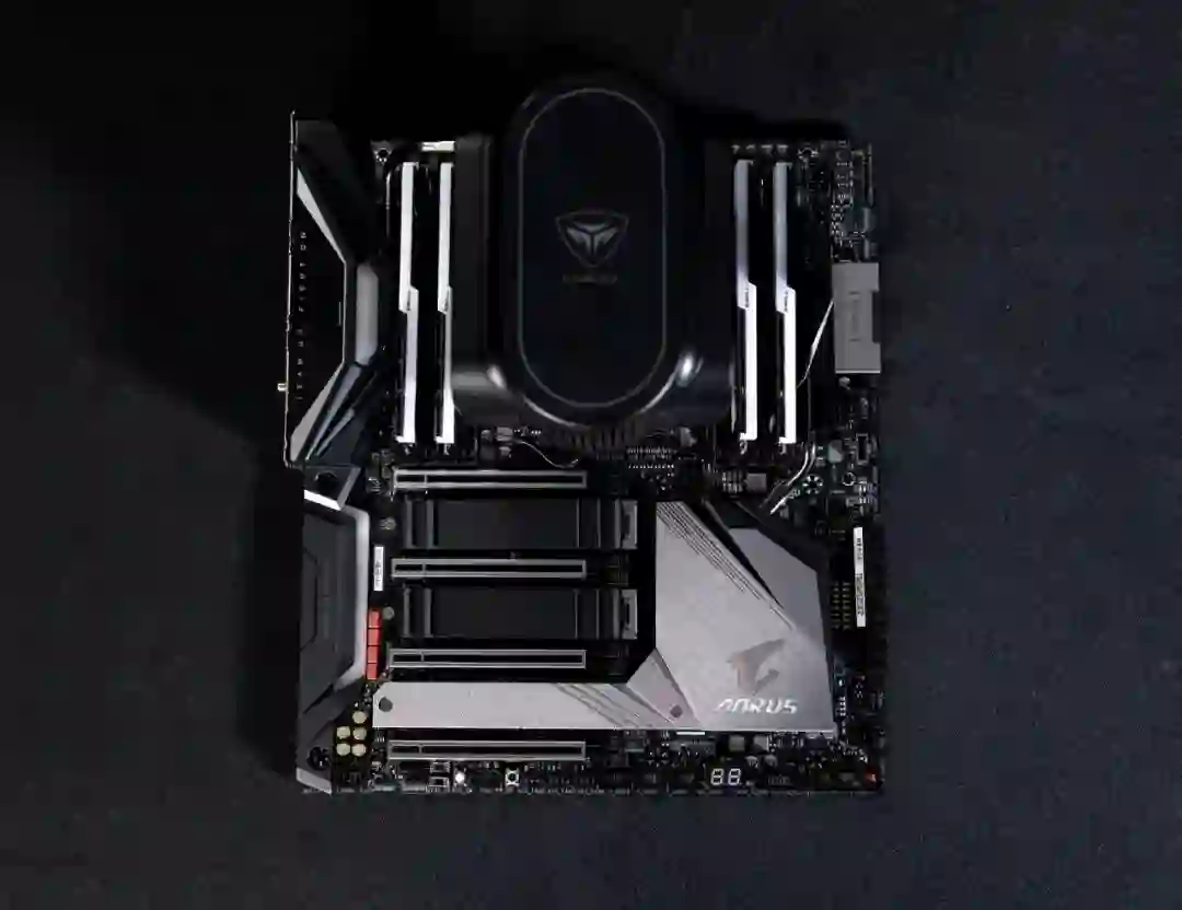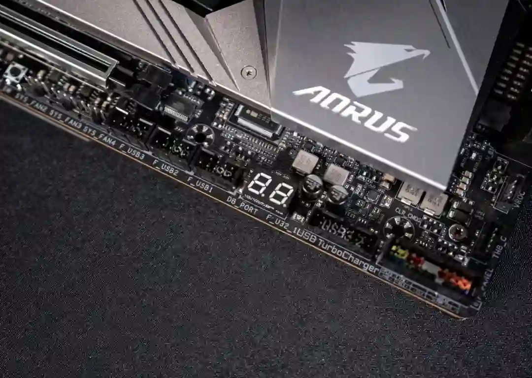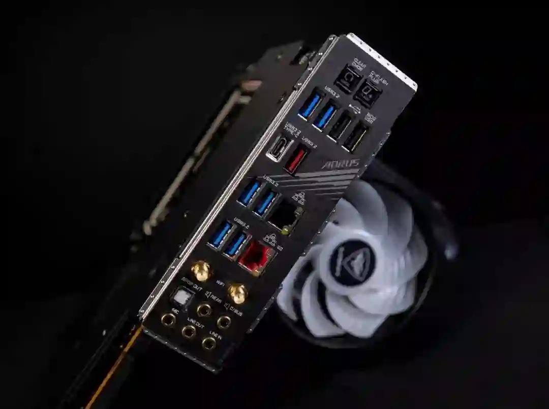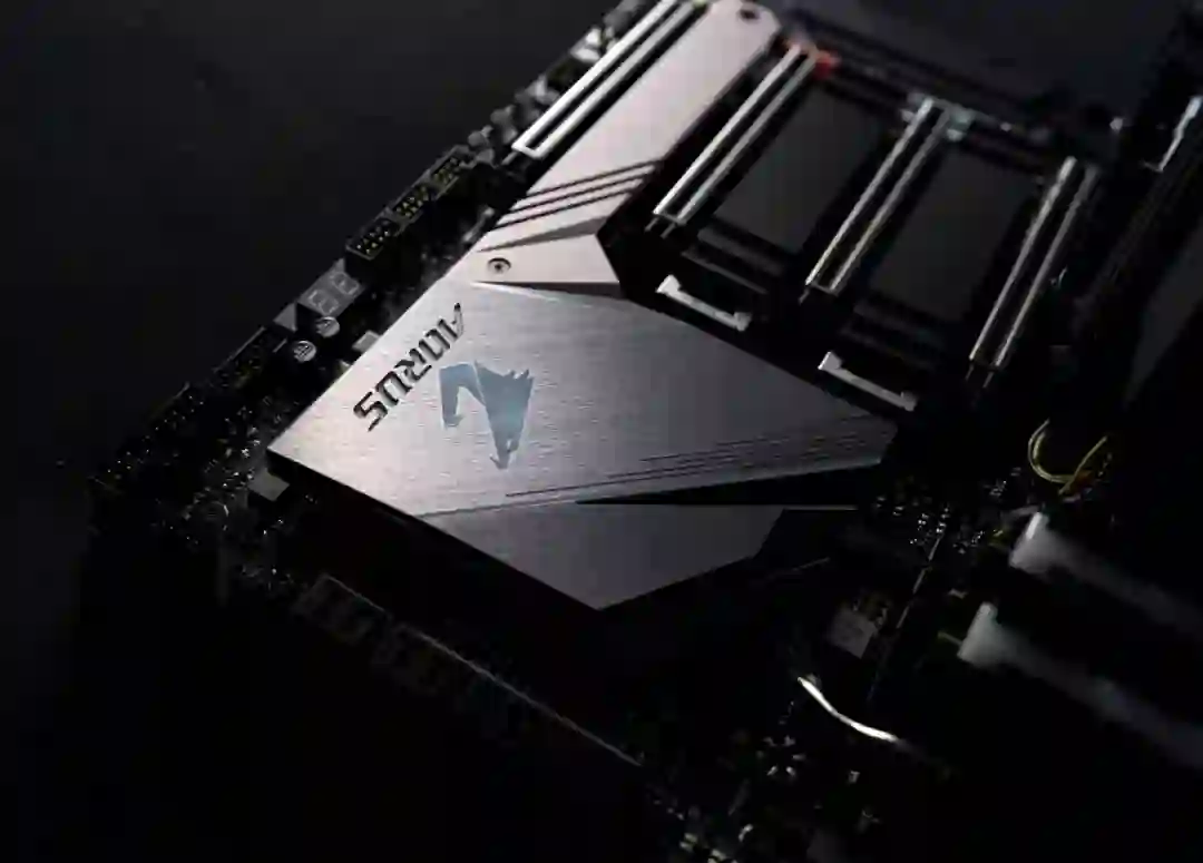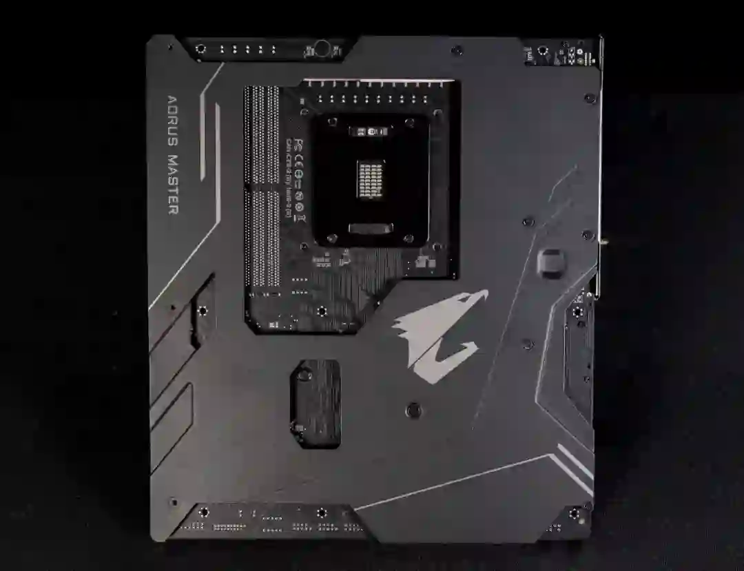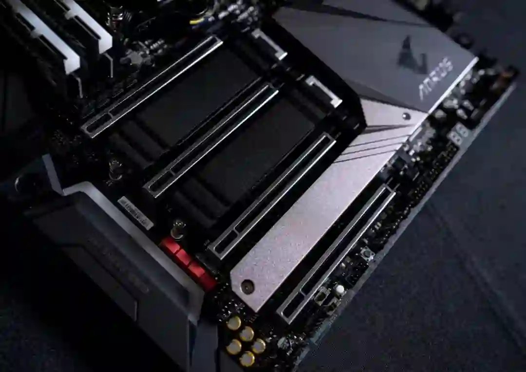 临时平台搭好是这样,我们先来细细品一下 AORUS 的新主板,最近技嘉的设计可以说慢慢的往工业性冷淡风这边靠,旗舰级主板大量抛弃了以往的 RGB 元素,更多的使用更有质感的金属部件,对于 RGB 不感冒的用户来说这一点非常值得肯定。