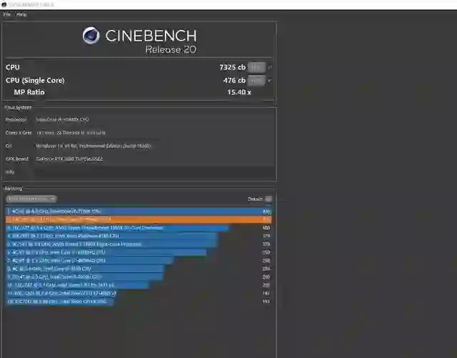 R20 这边全核得分 7325 分,单核得分 476 分,正好跟 7700K 相当,估计是睿频 3.0在这个软件中没有发挥到作用。