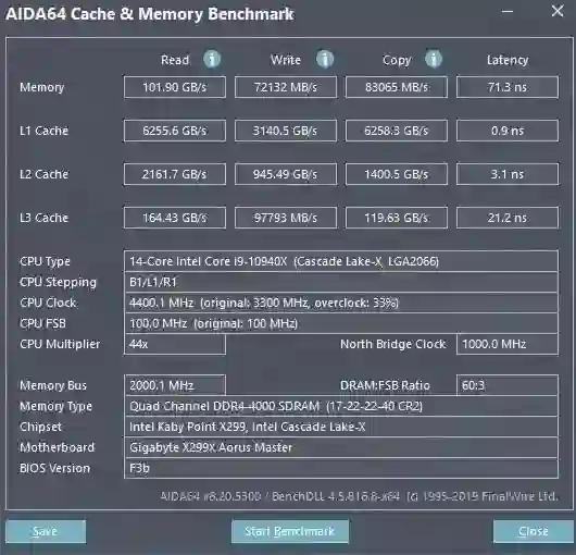 X299X AORUS MASTER 依旧是 LGA2066 接口,上代 i9-9980XE 也可以兼容,不过一般买新主板的都是配着新 U 一起的,这次临时用的 i9-10940X,14 核 28 线程,基本频率 3.30GHz、最大睿频 4.60GHz,165W TDP,配合睿频加速 Max 技术 3.0 可加速到 4.8 Ghz。