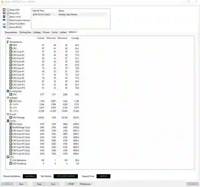 虽然这个平台最终散热不是这个临时的超频 3 D66A,不过我也好奇这个 200 出头的散热能不能压住 14 核的 10940X,通过长达 4 个半小时的非 AVX 指令 FPU 测试,核心平均温度在 85度左右,不少核心平均温度也在 75 度左右,全核心频率维持在了 4.1Ghz,处理器功耗显示为 240W,看来这个风冷散热还能一战。
