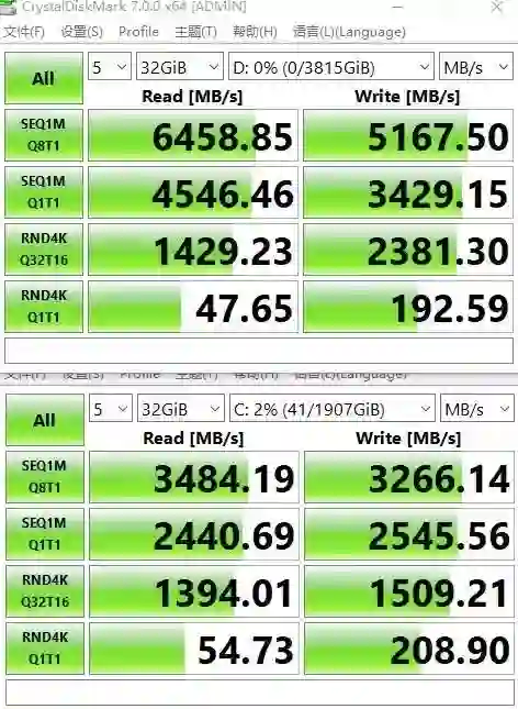 于是便在系统的硬盘管理器里给两个非系统盘的 C2000Pro 组了个 Raid0 玩玩,没想到的是真的成功了,大文件读写速度对比系统盘成倍增长,虽然 4k 读写速度没啥变化,不过这个 4T 的 “PCIe 6.0” 硬盘看起来还是很唬人的!