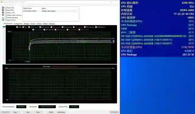 在带 AVX 指令集的烤机下,核心频率降到了 3.2Ghz,核心温度均未超过 80 度,功耗也是 200W 出头,可见英特尔对于 AVX 还是蛮宽松的,同时也能观察到主板供电温度仅仅才 62 度。