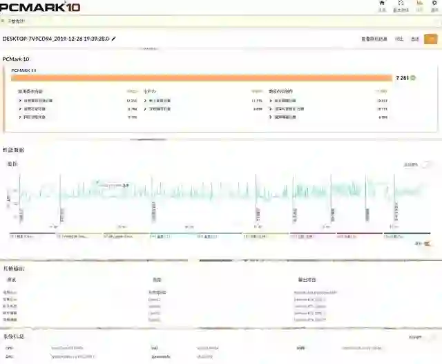 在 PCMARK10 整机性能测试中,10940X+2080Ti 取得了 7281 的高分,记录得到的 CPU 最高温度为 63 度,同时也在程序中观察到在打开网页及单核运用的时候,10940X 的睿频频率非常灵敏的运作在 4.8Ghz 和 4.6Ghz 之间。