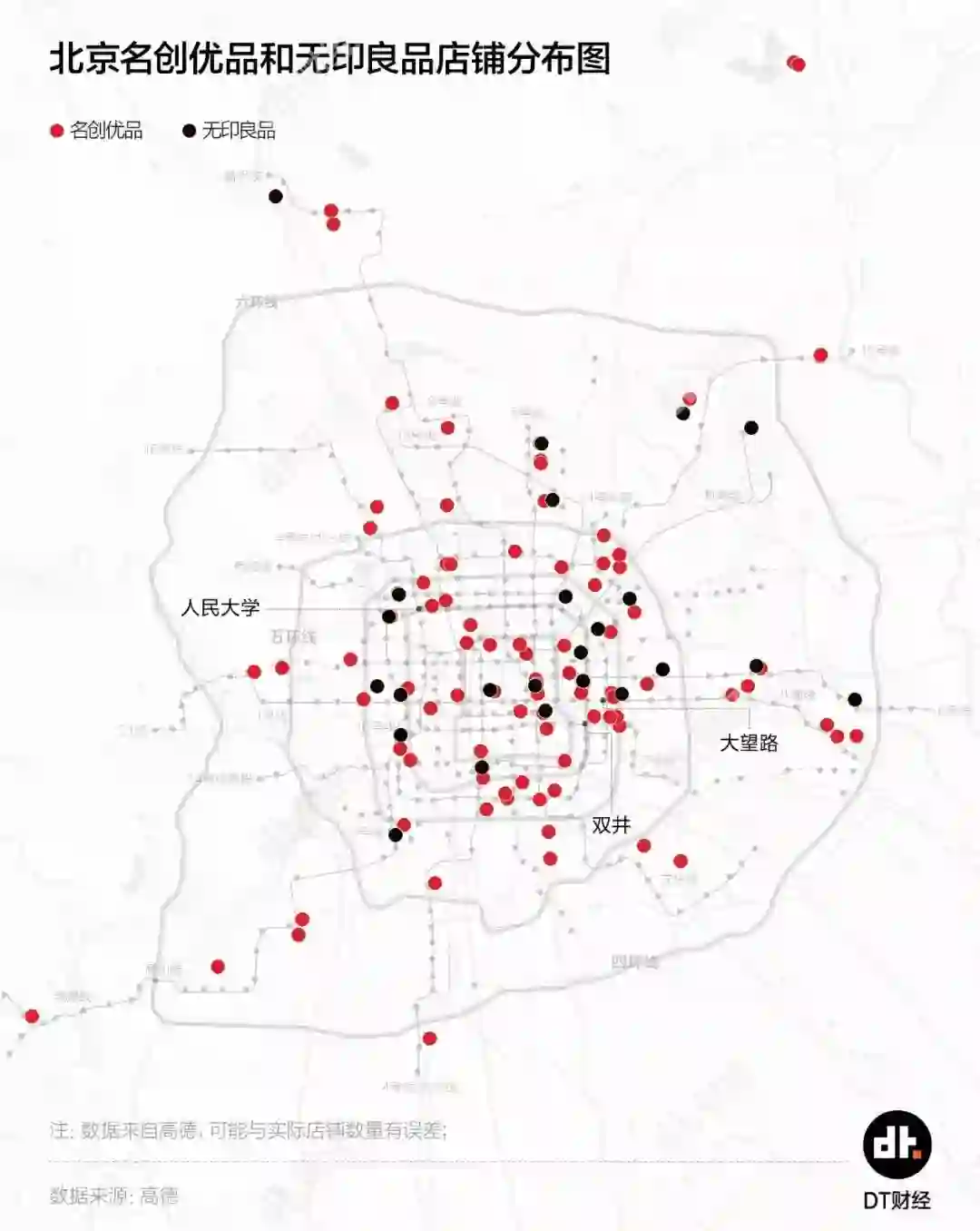 只是,看门店站位质量,无印良品竟然也没啥优势。镜头拉近到城市内部,以两者店铺数量最多的北京为例,无印良品的店面基本都分布在核心城区地铁站周围,人流密集、资源丰富。而在这些无印良品附近,往往还有开在商场里的名创优品。