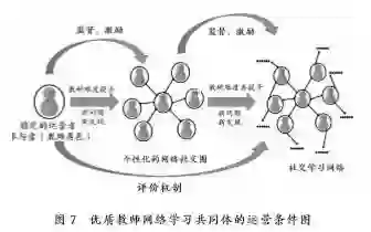 网络学习共同体中每个个体交往行为的交叉性,构成了网络学习共同体的运营模式。基于社交学习网络视角,“互联网+”环境中教师网络学习共同体的运营模式,主要应满足三个条件(1)大数据分析技术下的社交链接条件;(2)交互中的教研过程设计条件;(3)评价和监督条件,如图7所示。