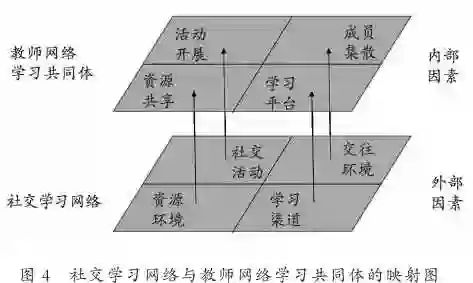 如图4所示,我们将社交学习网络分为:学习渠道、资源环境、交往环境、社交活动四个方面,从这四个方面出发构建教师网络学习共同体的外部因素集合,在网络的环境里构建情境,搭建上层的教师网络学习共同体结构和内部环境。