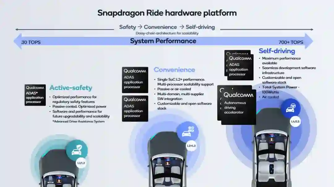 AI 能效是骁龙平台的技术优势。除了智能座舱,高通还在汽车领域推动可扩展开放自动驾驶解决方案 Snapdragon Ride。该平台面向不同驾驶场景提供不同等级算力:它可以以小于 5W 的功耗为摄像头提供 10 TOPS 机器学习算力,也能为 L4、L5 级自动驾驶提供超过 700 TOPS 算力。