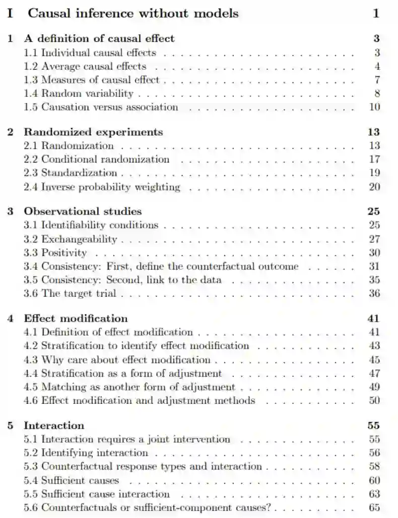 哈佛大学生物统计学和流行病学教授 Miguel Hernan 和 Jamie Robins 最近一直在写一本书,并希望为因果推理的概念和方法提供一个连贯性的介绍。他们表示目前因果推理相关的材料大部分都分散在多个学科的期刊上,或者存在各种技术文章中。他们希望这本书能帮助各种对因果推断感兴趣的读者,不论是流行病学家、统计学家、社会科学学家还是计算机科学家。这本书主要分为三部分,它们的难度依次递增:不带模型的因果推理、带模型的因果推理、复杂长跨度数据的因果推理。