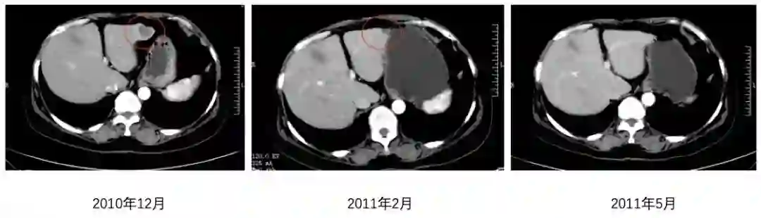 2011年2月2周期治疗后复查腹部CT示:肝转移灶较前对比明显缩小,综合疗效评价为部分缓解(partial response,PR)。4周期治疗后于2011年5月复查腹部CT示:肝脏未见转移灶,其综合疗效评价为完全缓解(complete response,CR)。后患者因不能耐受化疗的毒副作用,仅采用曲妥珠单抗维持治疗,用药期间定期复查,截至目前未见明显转移与复发征象,其无进展生存期(progression-free survival, PFS)为103个月。