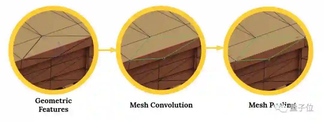 类似传统CNN,MeshCNN结合了在网格边缘上运行的专用卷积和池化层。卷积应用于边缘和它们的入射三角形的四个边缘,池化层用边缘折叠操作保留表面拓扑结构,给后面的层生成了网状连接。