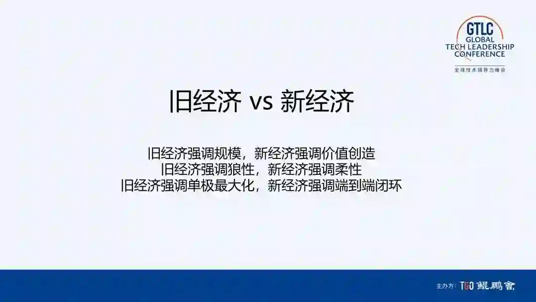 再看中国新经济下企业的特点,就是内核 + 强势产业链的模式。中国的制造环节在全球是绝对领先地位,产业链完整,效率非常高。短视频我理解也是产业链,因为中国的内容制造很强大,包括生活家电代工做出海势头强劲,不仅价格便宜,而且功能强大、迭代速度快,所以在海外市场巨大。因为产业链能力特别强,我们称它为科技外溢。例如将在电动车行业应用广泛的无极电刷和健身融合起来,避免运动中对身体的伤害;以及在医疗产业链上应用很广的冻干技术,现在可以用来制作咖啡;这样的例子还有很多。旧经济强调规模,新经济强调价值创造;旧经济强调狼性,新经济强调柔性;旧经济强调单极最大化,新经济强调端到端闭环。