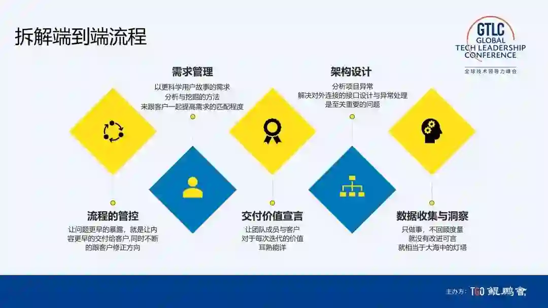 首先,使用用户故事工具,来提高需求匹配的程度,把讲故事作为整个团队工作的核心。只有跟客户一起讲故事,才能围绕价值创造推进项目。用户故事最有价值的地方是建立一公里宽,还能做到一公里深。我们以前的需求是全,能做到一公里宽,但只有一厘米深。用户故事很简单,难的是端到端都相信用故事来驱动工作。我们说服研发团队围绕用户故事做构建,按照用户故事的颗粒度来定义 Future,我们把它定义一个新的概念叫用户故事集,这是对团队心智的挑战。最难的挑战是围绕用户故事做交付。我们一个项目两个月做交付,会两周做一次客户业务部门参与的 Demo 日,真正落实的程度非常高。全流程端到端做用户故事是最重要的实践价值。