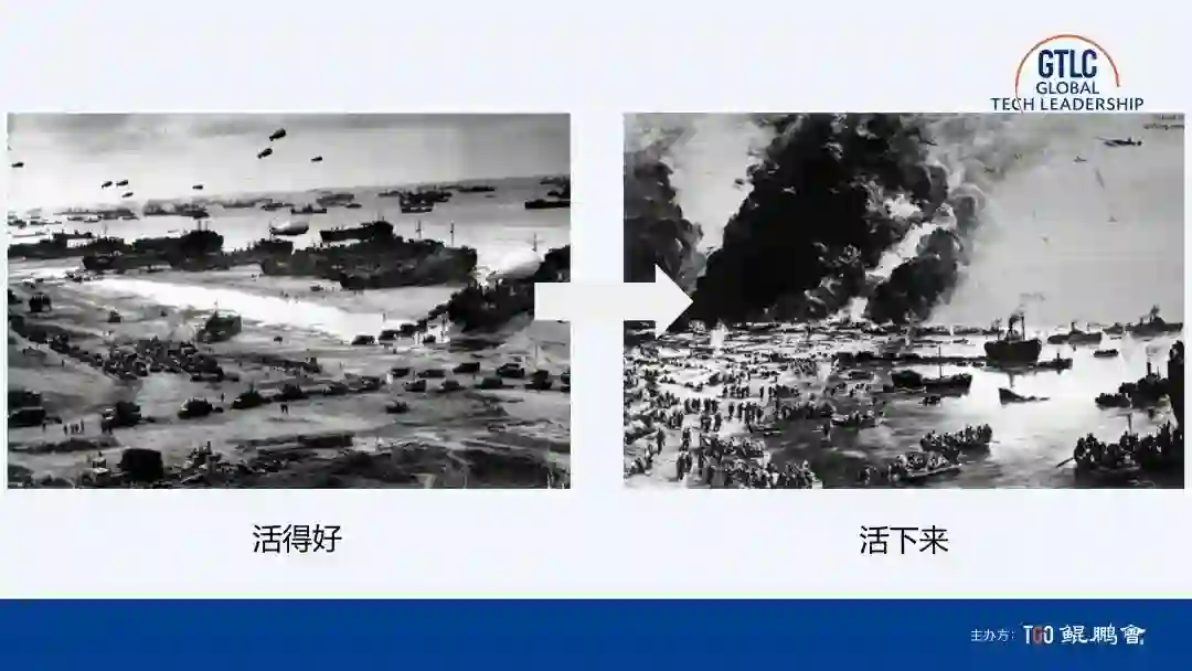 首先看经济。我默认大多数同学现在的企业都面临像我服务企业一样,正在经历生死考验,我们是亲身经历者。但前几年,大家的思维方式和现在大不相同,都在考虑我怎样做一件伟大的事。这两张图片大家都很熟悉,这两个看上去很像的场景,一个是诺曼底登陆,表示规模化,活得好;第二个是敦刻尔克,考虑的是有序撤退,这是很有意思的对比。