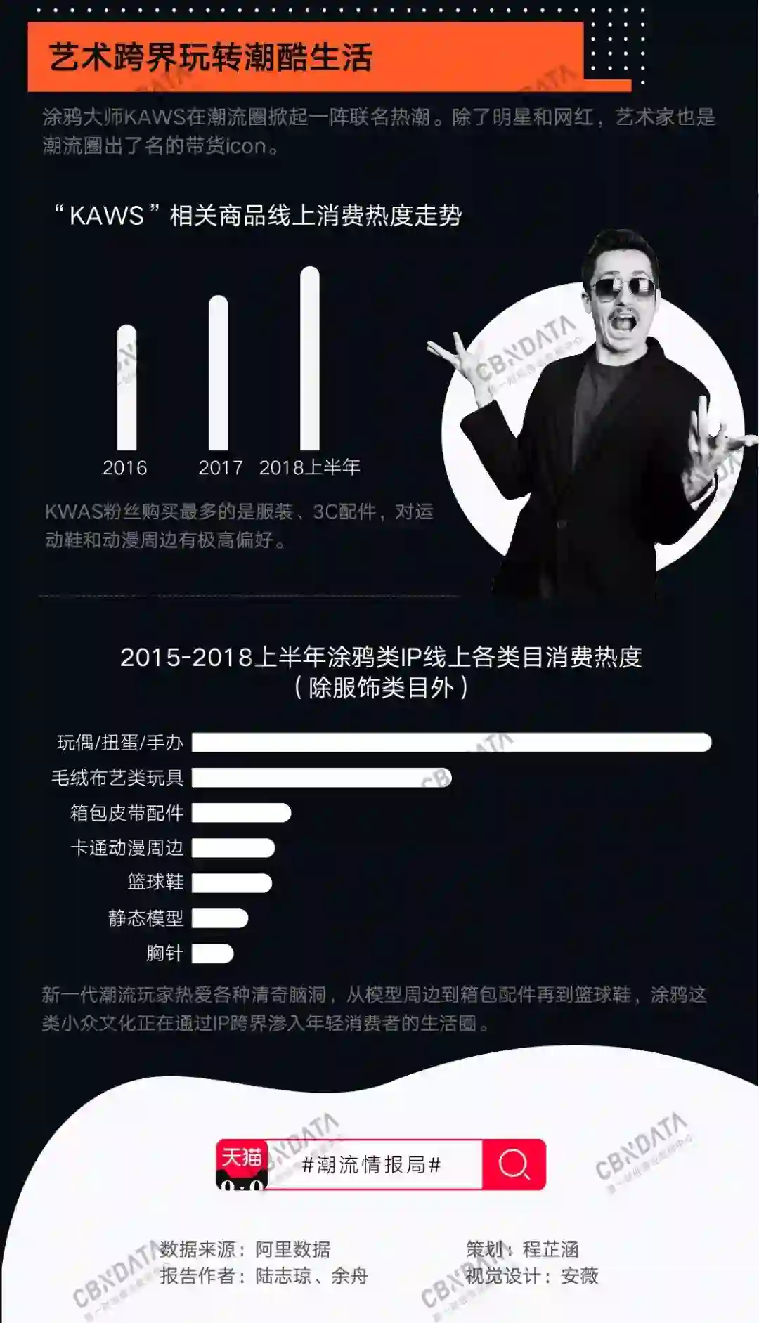 CBNData《报告》现实,KAWS的设计成为品牌带货利器,持续热销年年热潮。其中以优衣库的联名款系列为主要爆款,极为抢手;2018上半年KWS相关商品消费热度是2016全年的1.5倍。